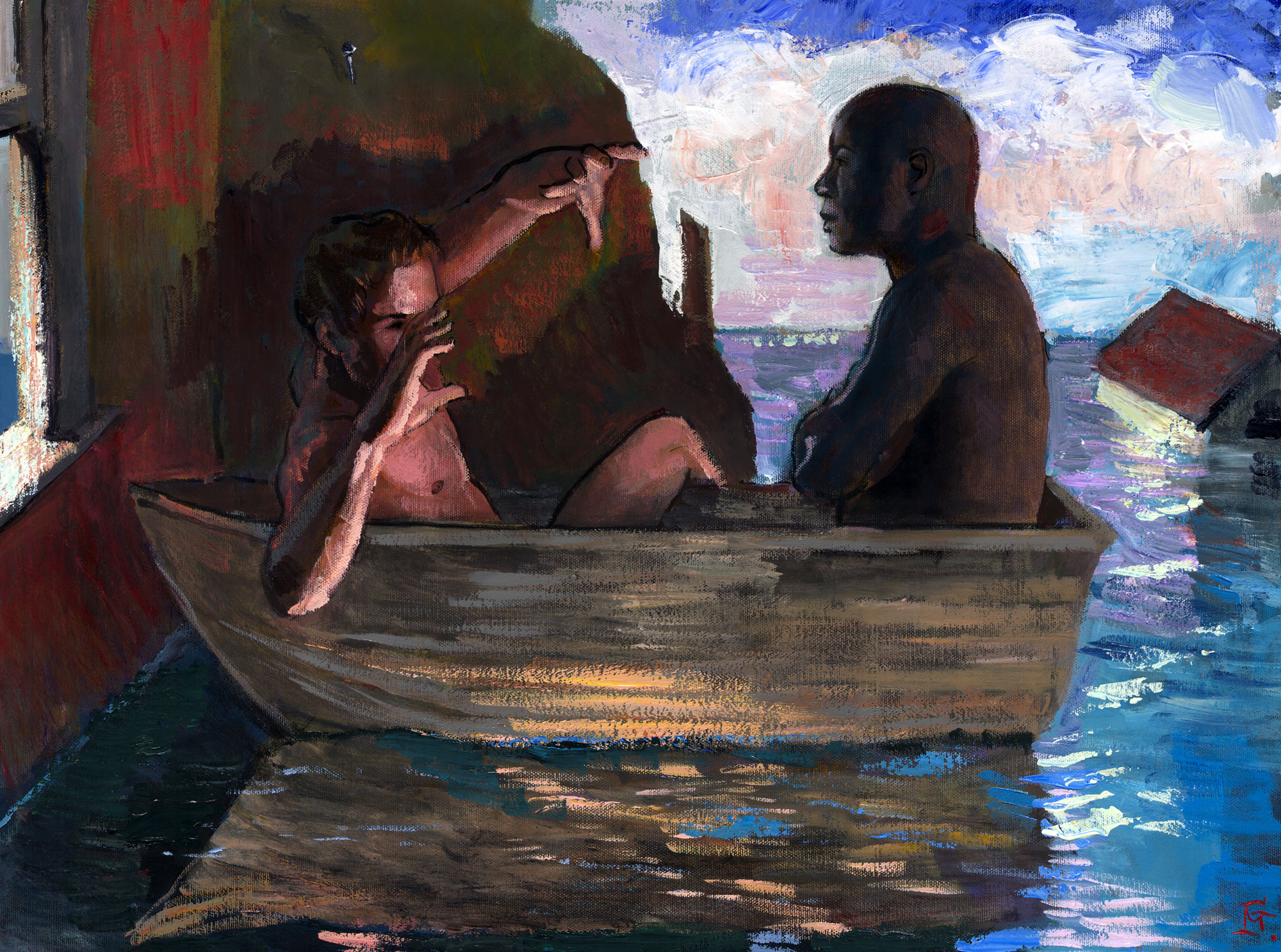 Others have every opportunity to communicate and don't. The "navigators," as Gladstone names them, are young men whose toy ships don't bring them together as friends in the lagoon in which they stand. The naked young man behind many doors in many paintings remains invisible to the dozing fatherly figure in the armchair. The boy seated in a dinghy across from a glowering Buddha-like black man (The Homecoming, 2007) is terrified, not led to reaching out.