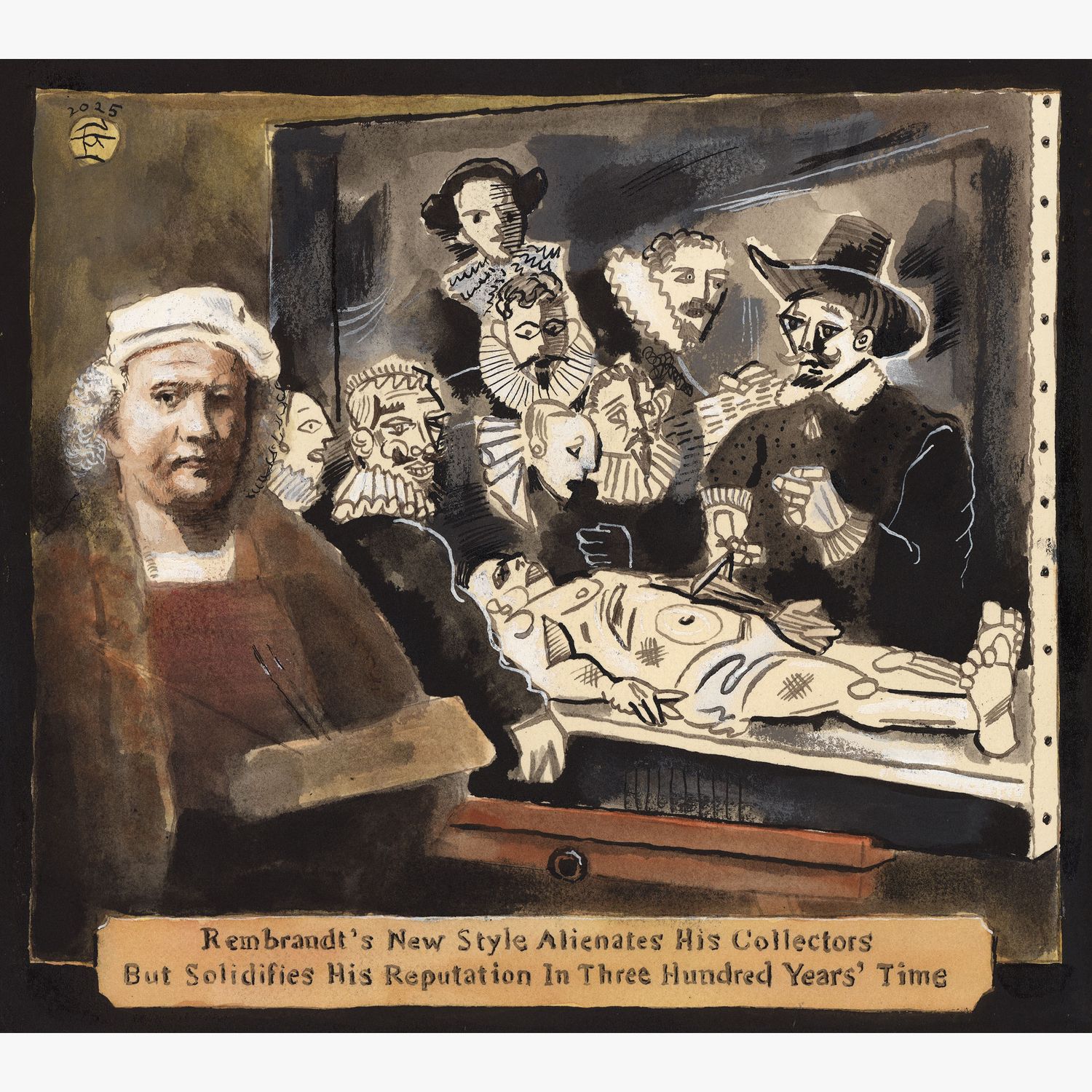 "While Secretly Hiding Away in the Museum After Closing Time, Hockney Has a Flash of Inspiration, Requires a Model, and a Night Guard Volunteers" Original Painting on Panel | Free Shipping Worldwide