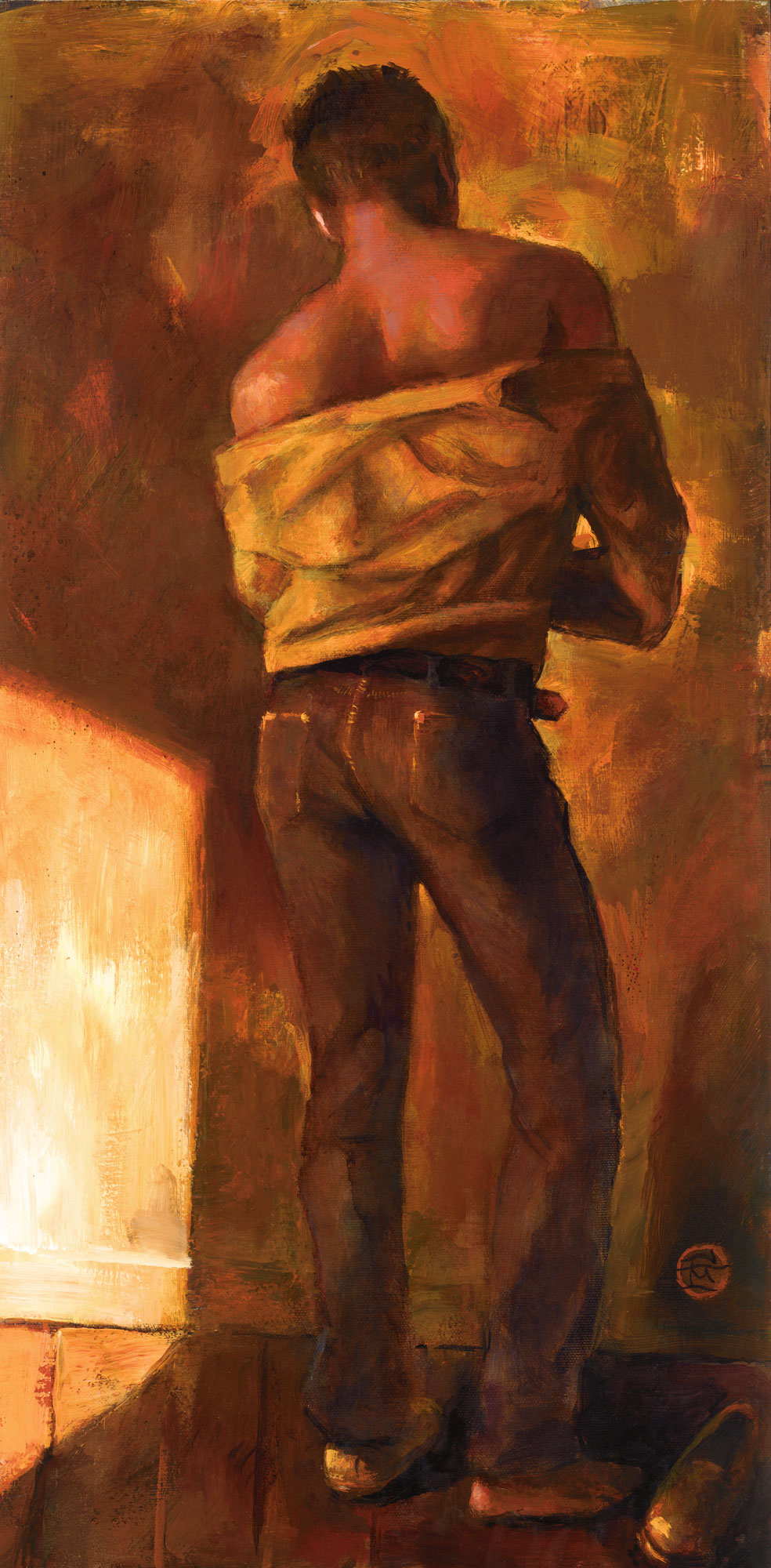 Additional keywords: original art, painting, ,interior, man, blue jeans, mirror