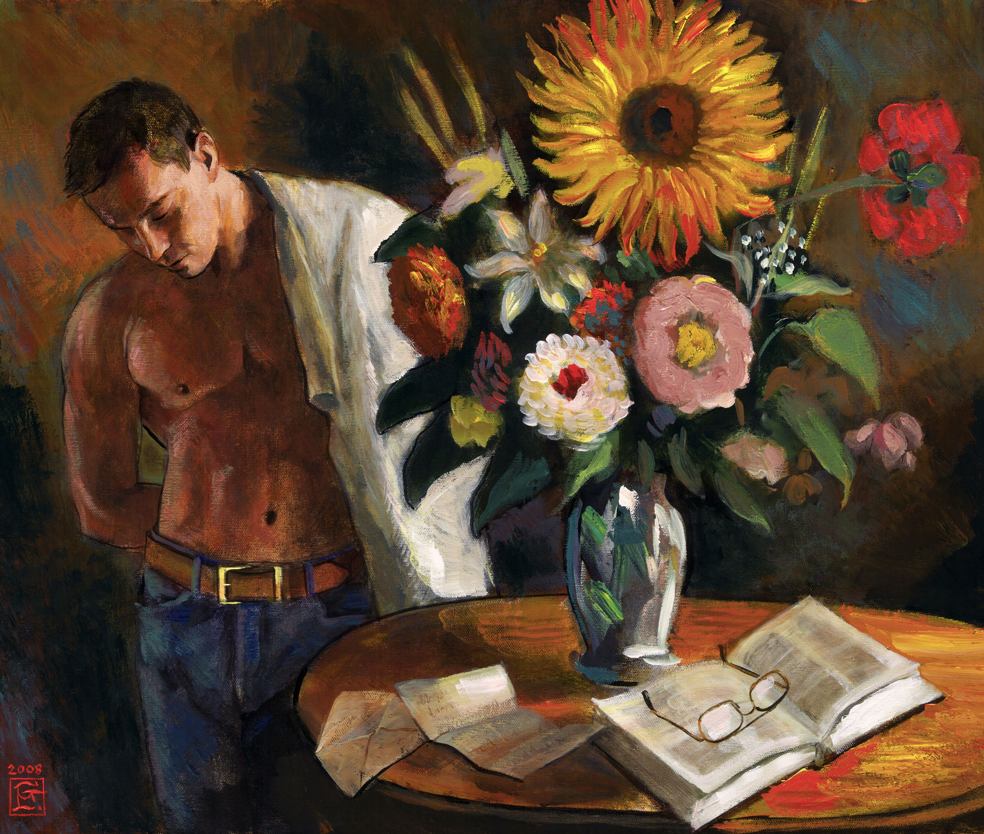 Additional keywords: original art, painting, male nude, shirtless man, blue jeans, table, flowers, book, glasses