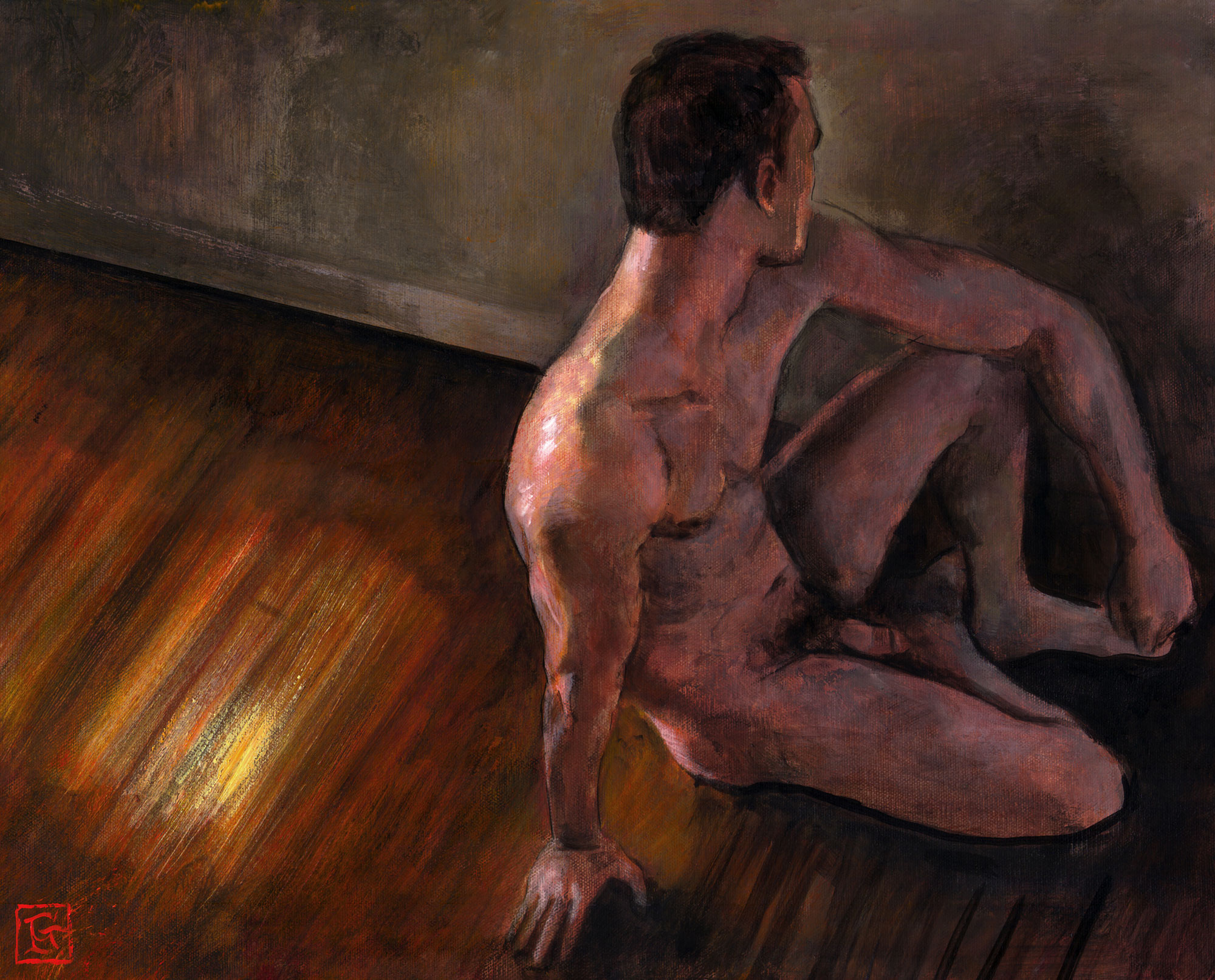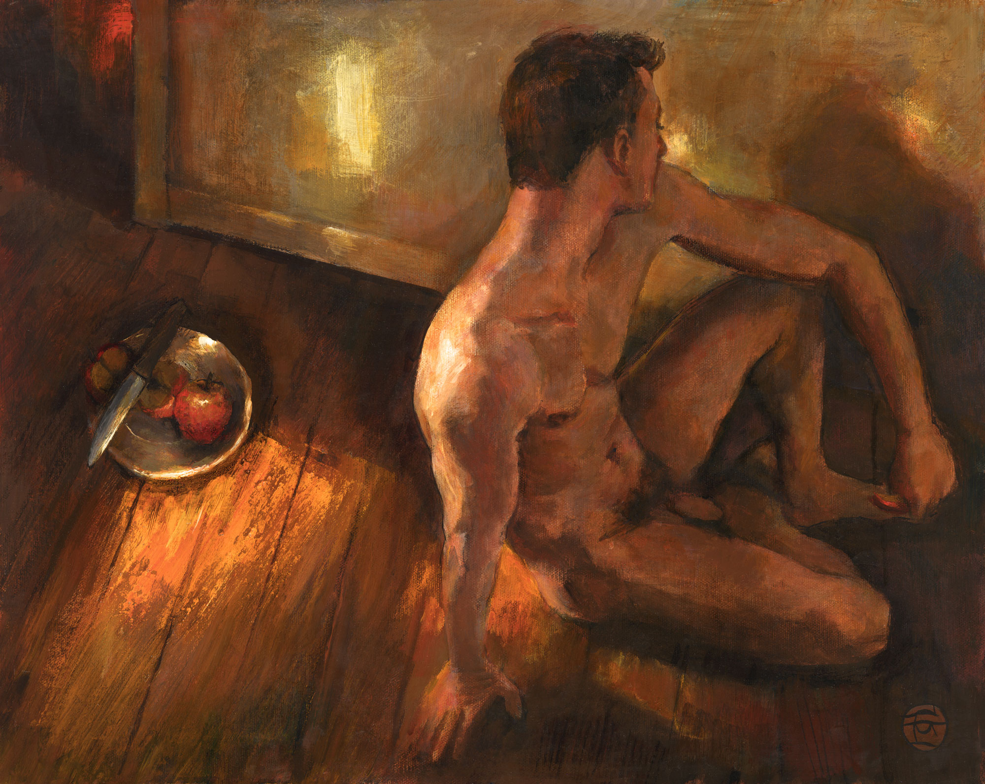 Additional keywords: original art, painting, male nude ,interior, nocturne, apple, knife