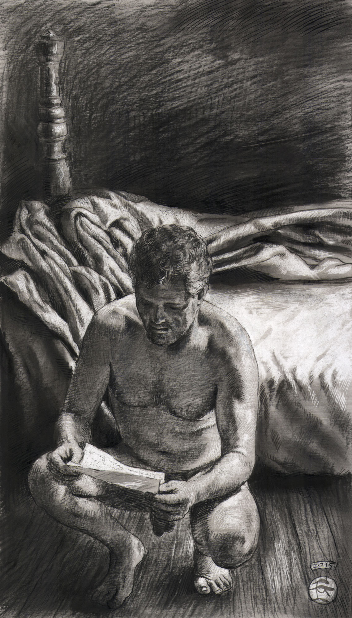 Additional keywords: original art, painting, male nude, interior, unmade bed