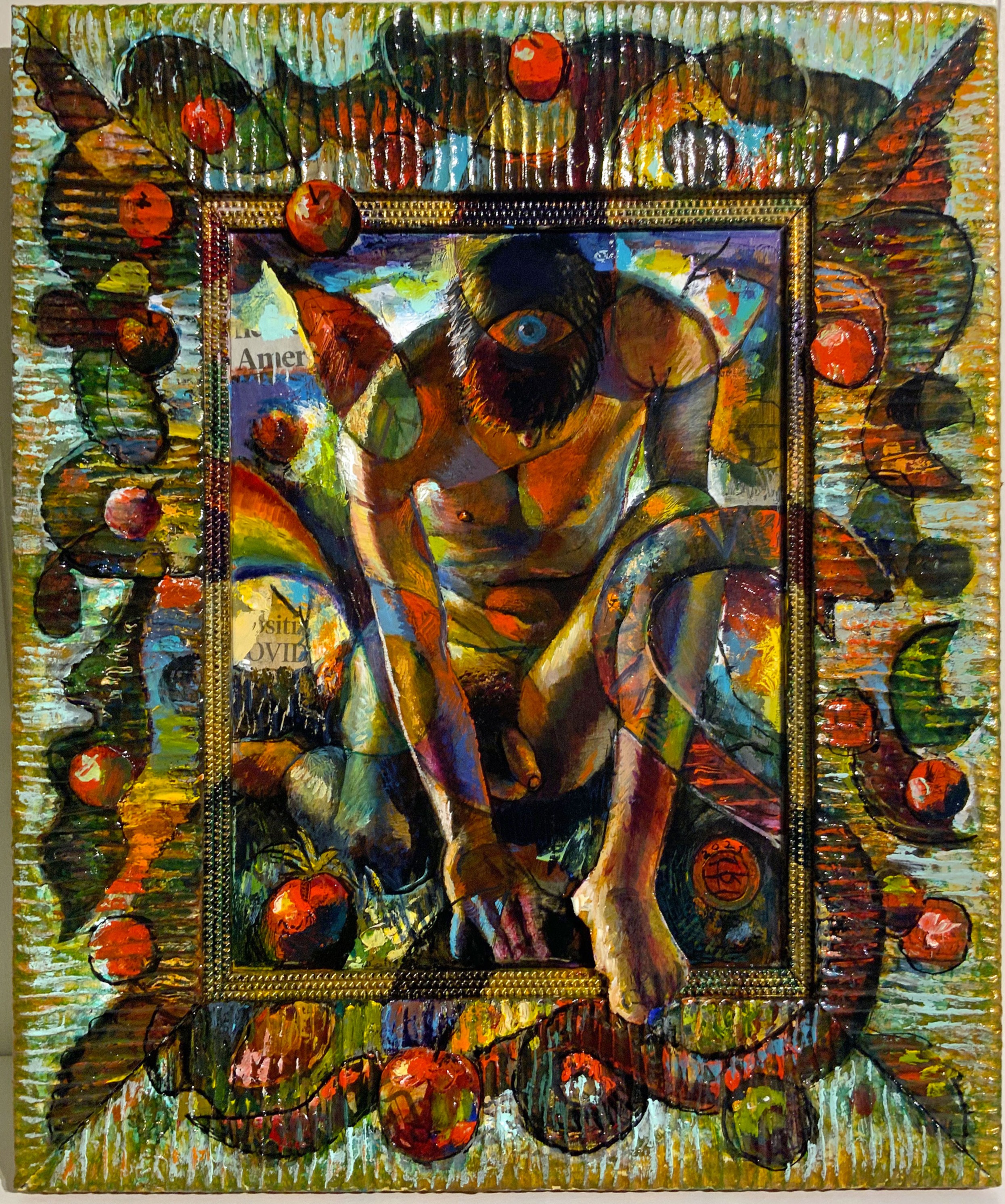 "The Orchard (An Apple a Day)", an allegory of contemporary isolation and anxiety, is a unique three-dimensional work painted on a framed panel and incorporating collaged elements