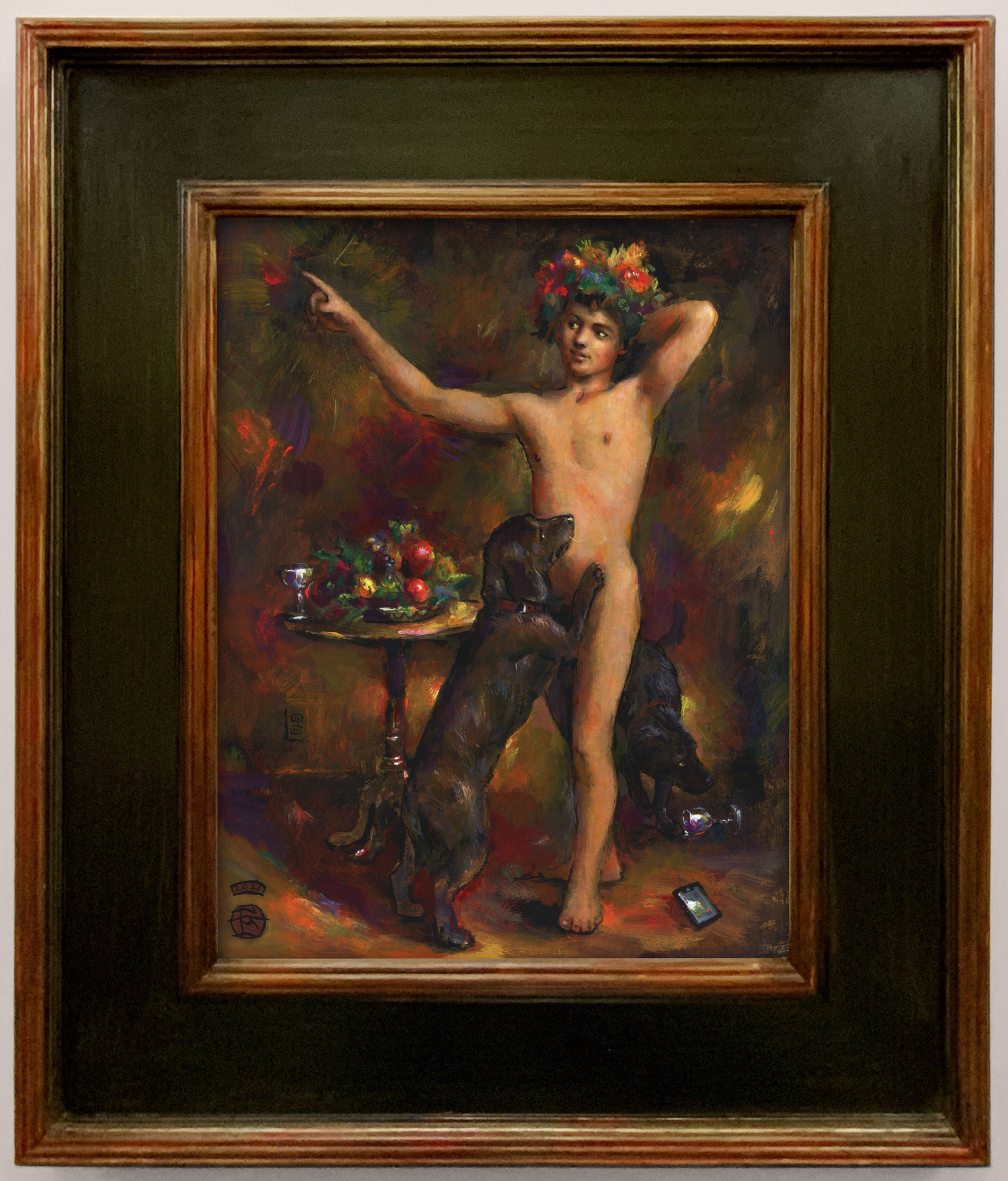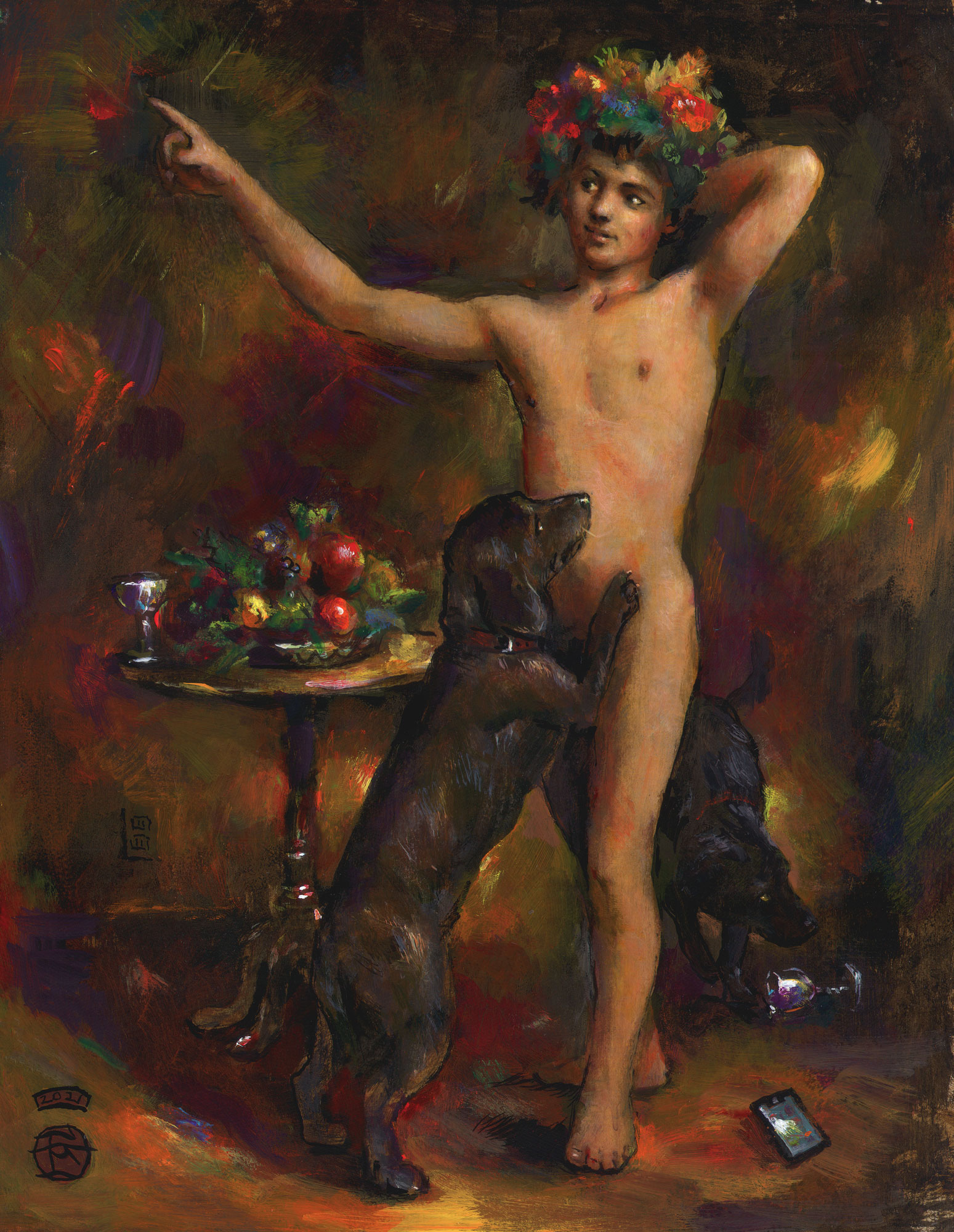 Additional keywords: original art, painting, male nude, wine, grapes, still life, dogs. iPhone, Bacchus
