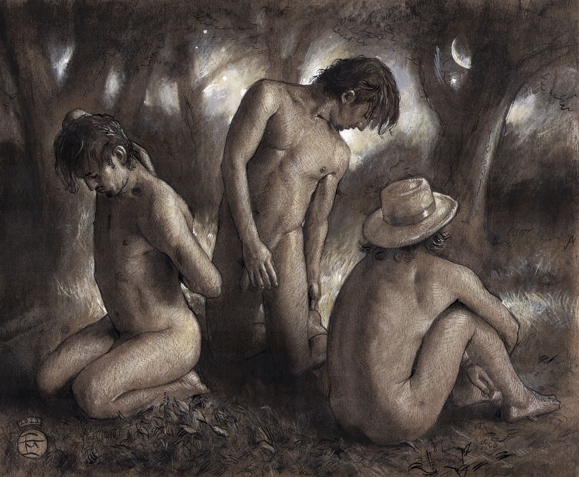 original art, drawing, male nude, woods, forest, straw hat