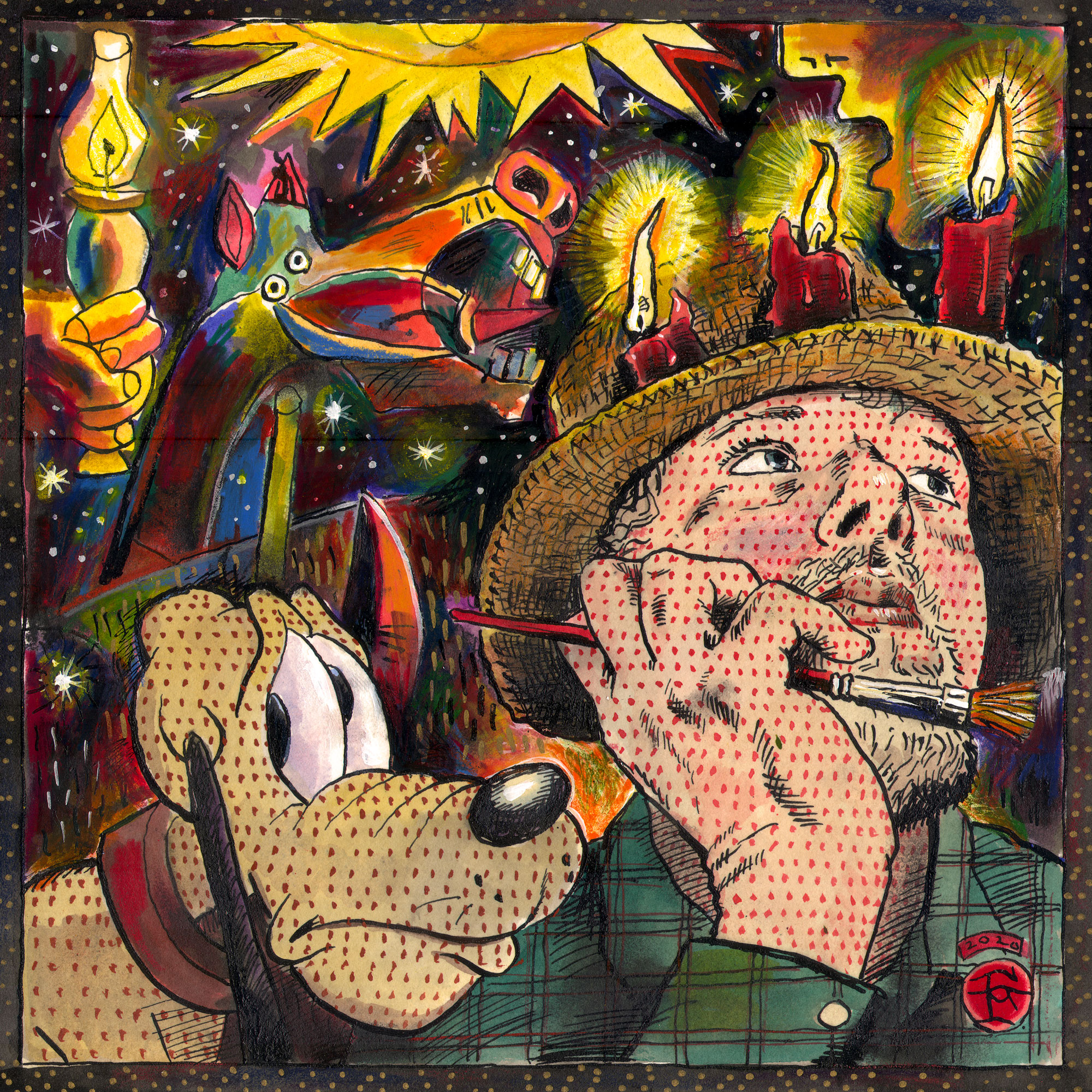 Copyright © Philip Gladstone, All Rights Reserved Additional keywords: original art, drawing, painting, Pop art, comic art, Pablo Picasso, Guernica, dog, Walt Disney, Pluto, candle, starry night |