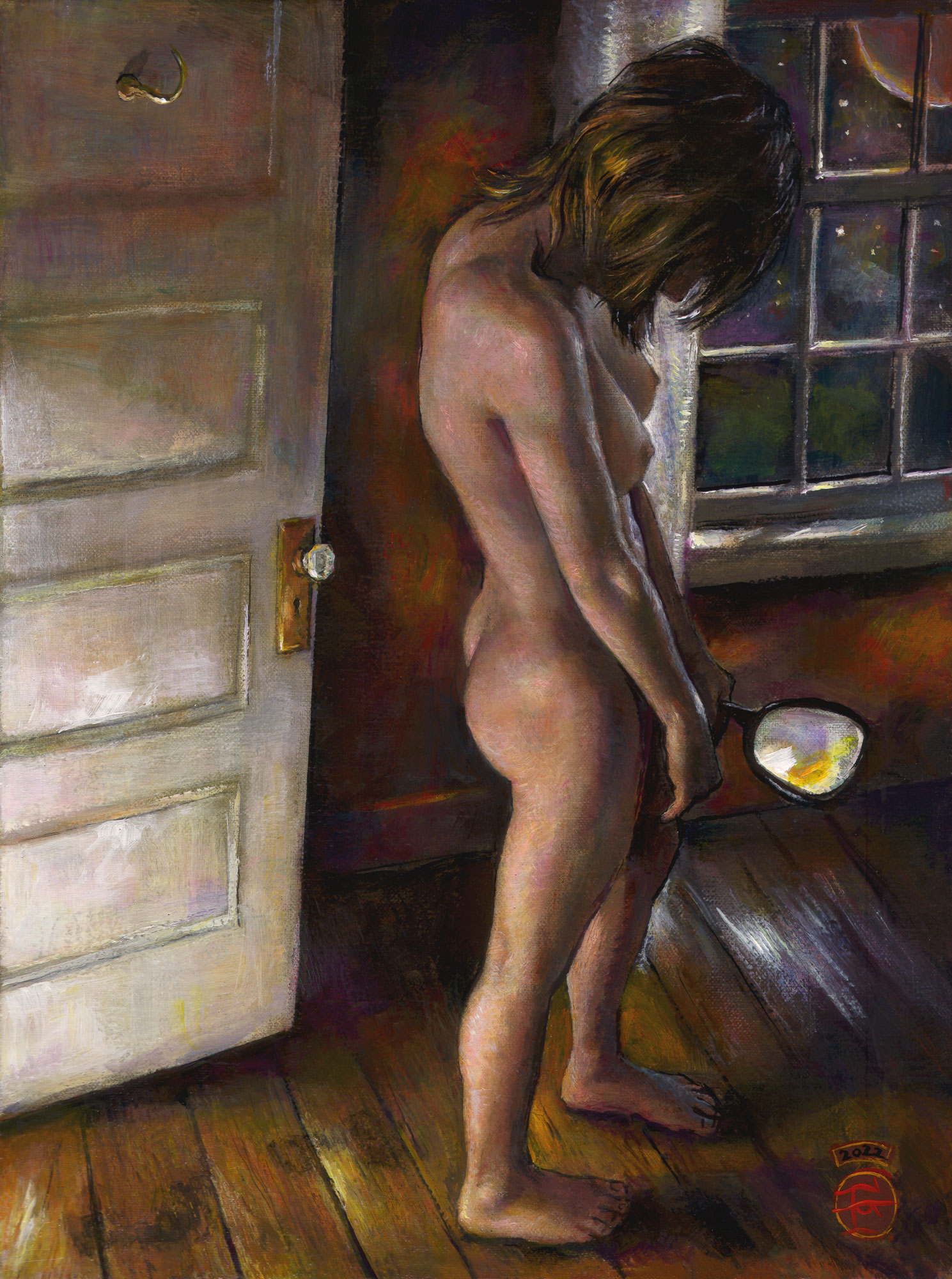 Additional keywords: original art, painting, female nude, interior, door, moon, starry night