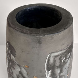 • Made with mixed-media (India ink, acrylic and charcoal with gold metal leaf fragments) on a wooden (Paulownia) vase, sealed with varnishes and hand-rubbed