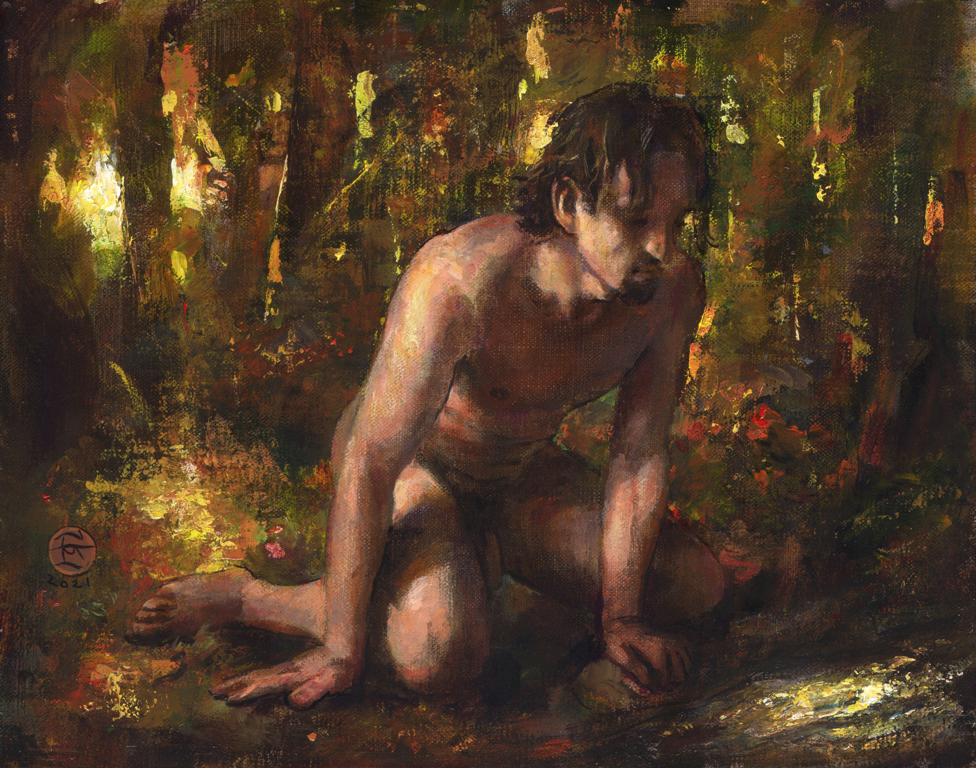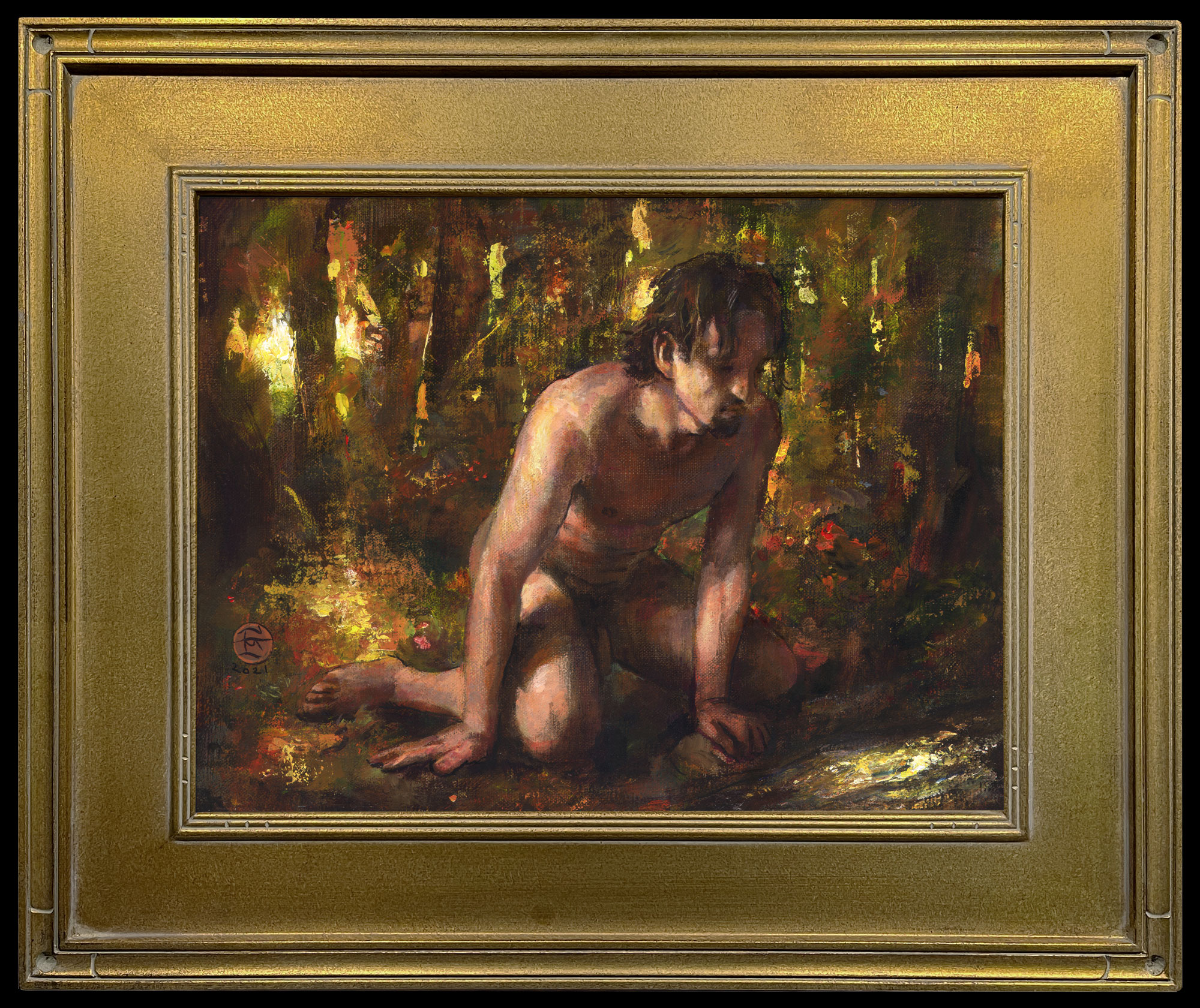 Additional keywords: original art, painting, male nude, landscape, woods, forest, trees, stream