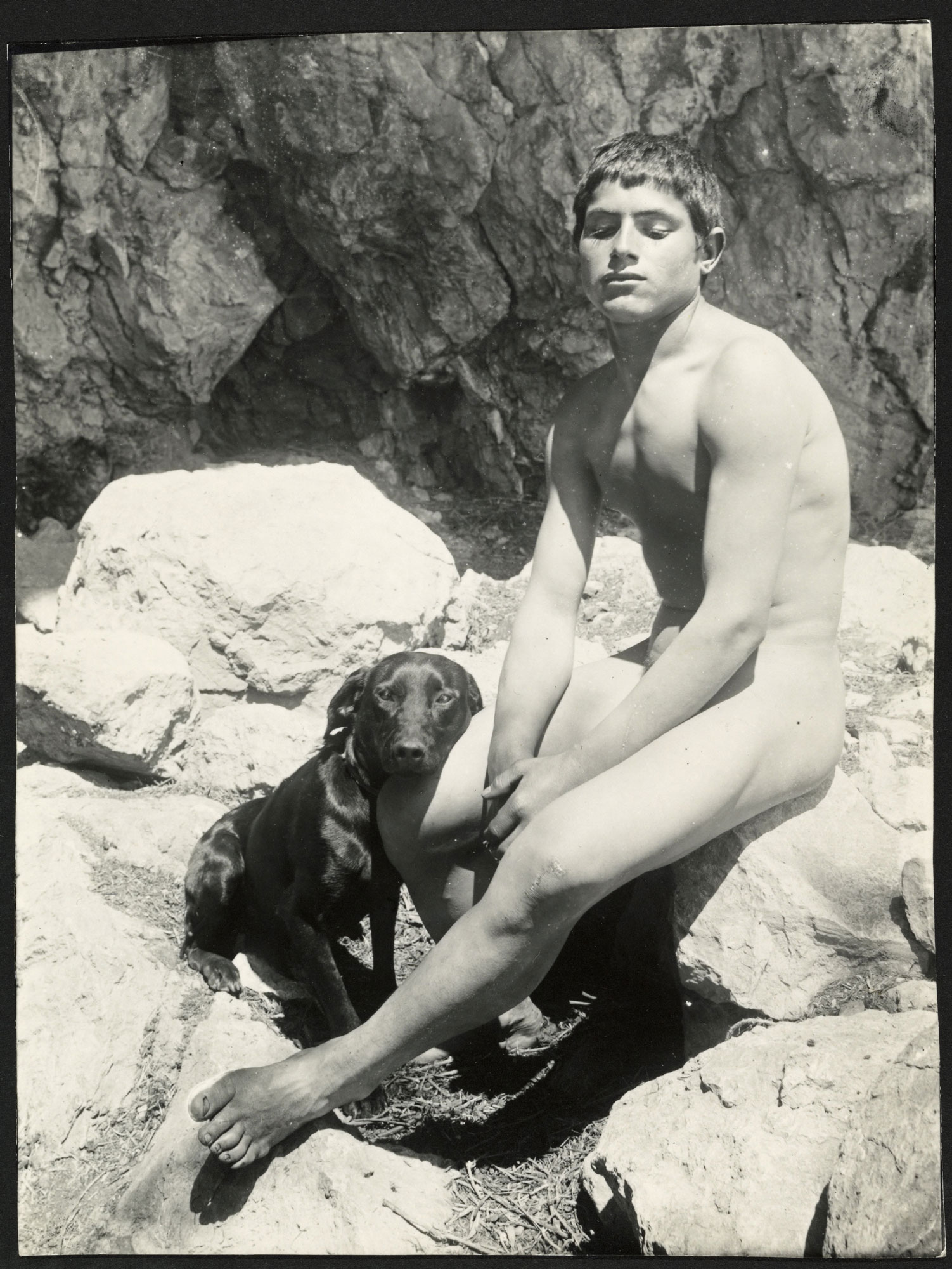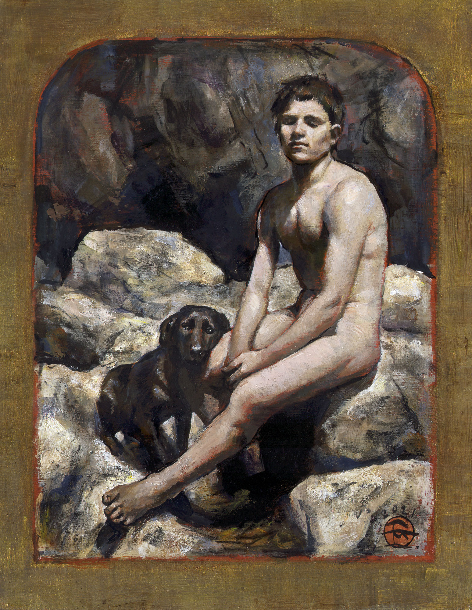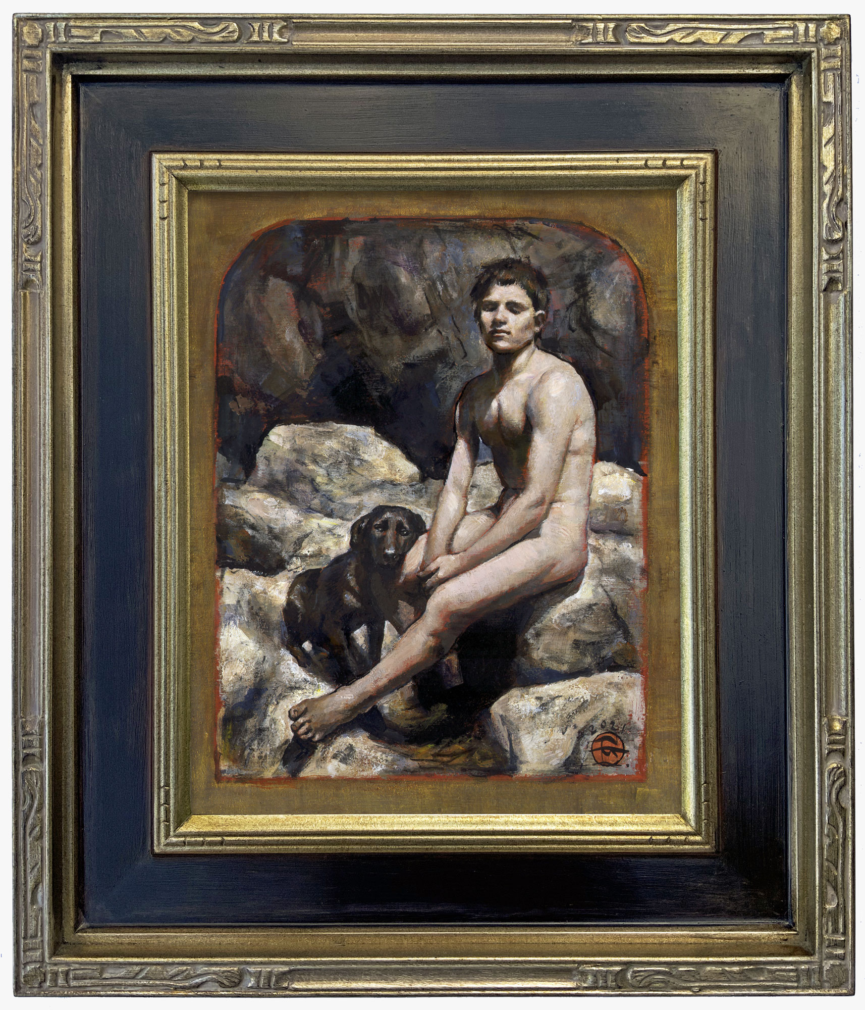 Additional keywords: original art, painting, male nude, rocks, landscape, dog
