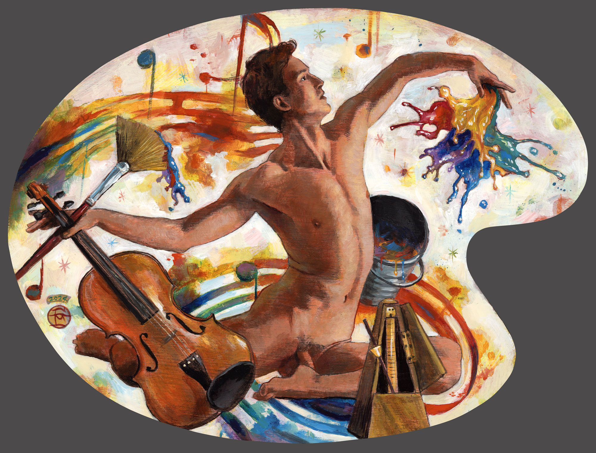 Additional keywords: original art, painting, male nude, dancer. musician, paint, viola, metronome