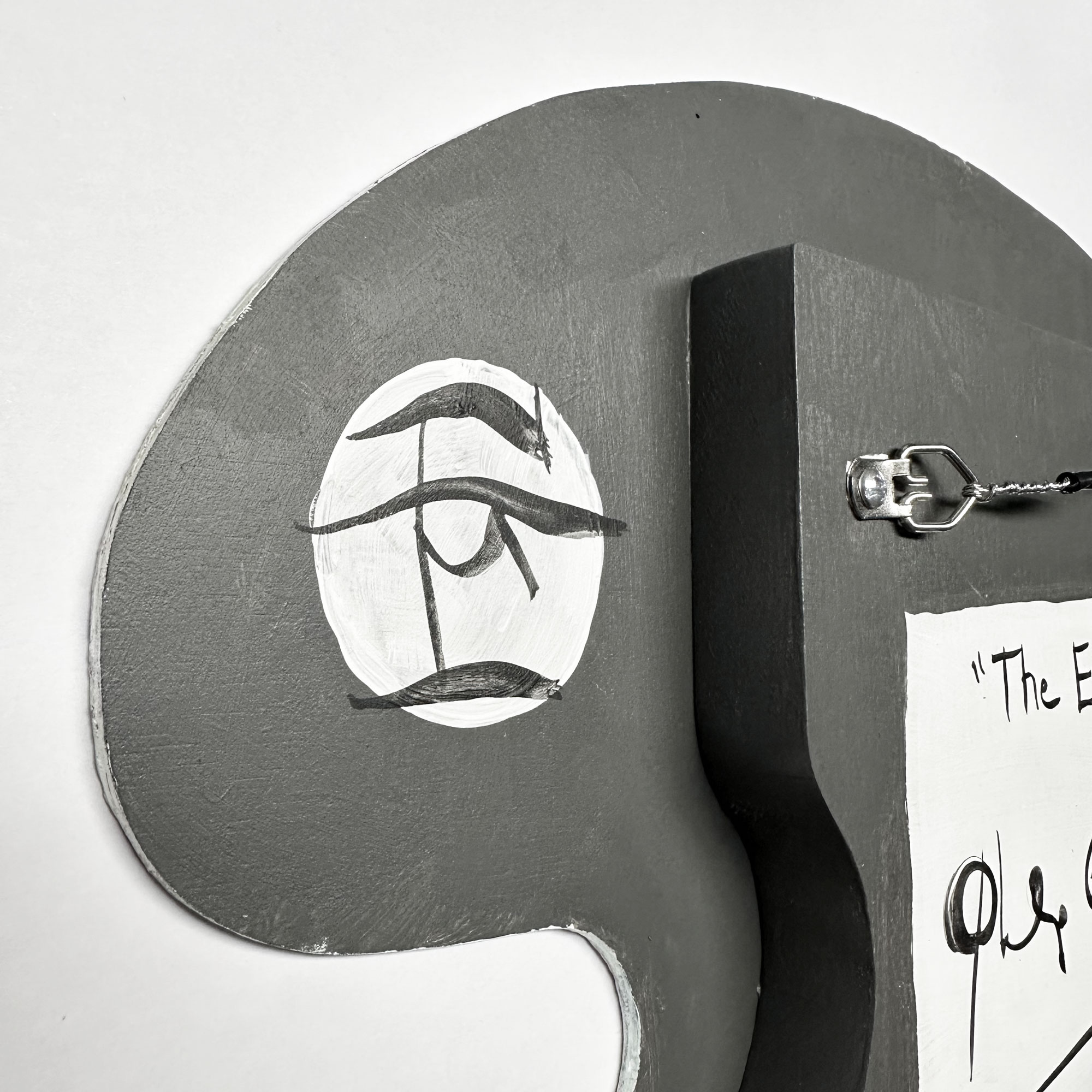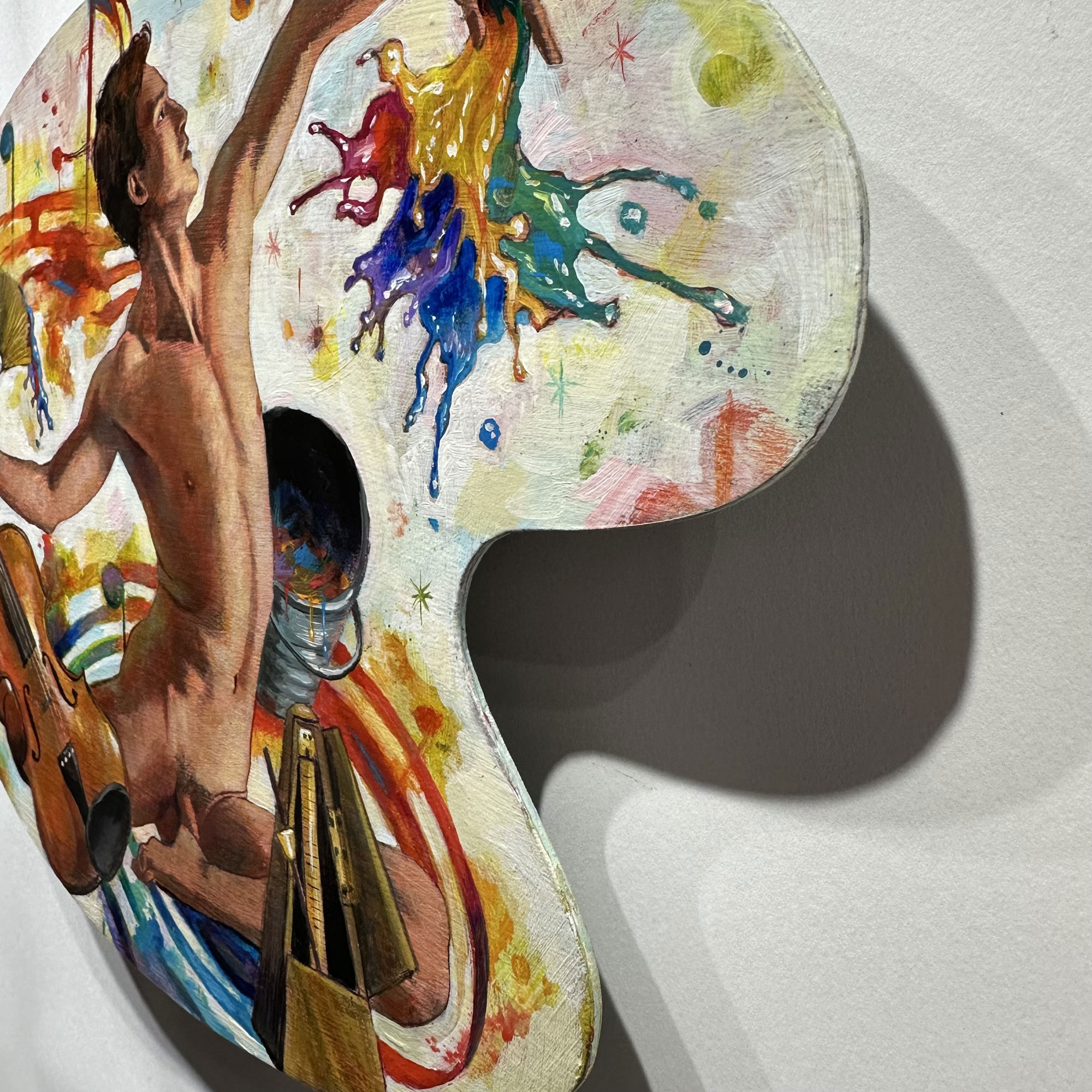 - Media: artist's professional acrylic paints on a gessoed MDF panel cut into the shape of an artist's palette; the panel is mounted to a second recessed panel, creating the illusion that the painting is 'floating' approx. 1" from the wall when hung