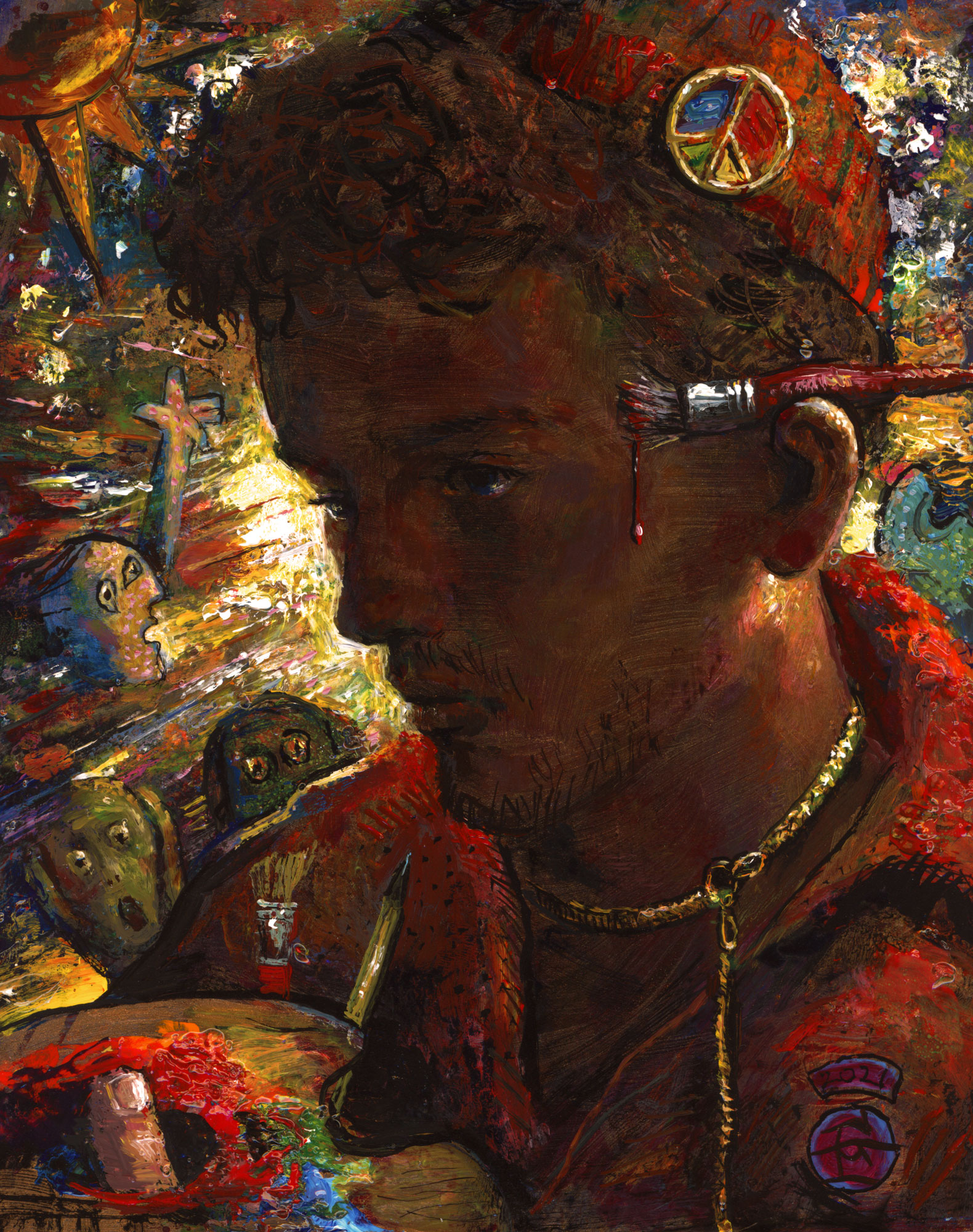 "The Young Artist Wages a Personal Art War" is an original acrylic painting on cradled panel by Philip Gladstone