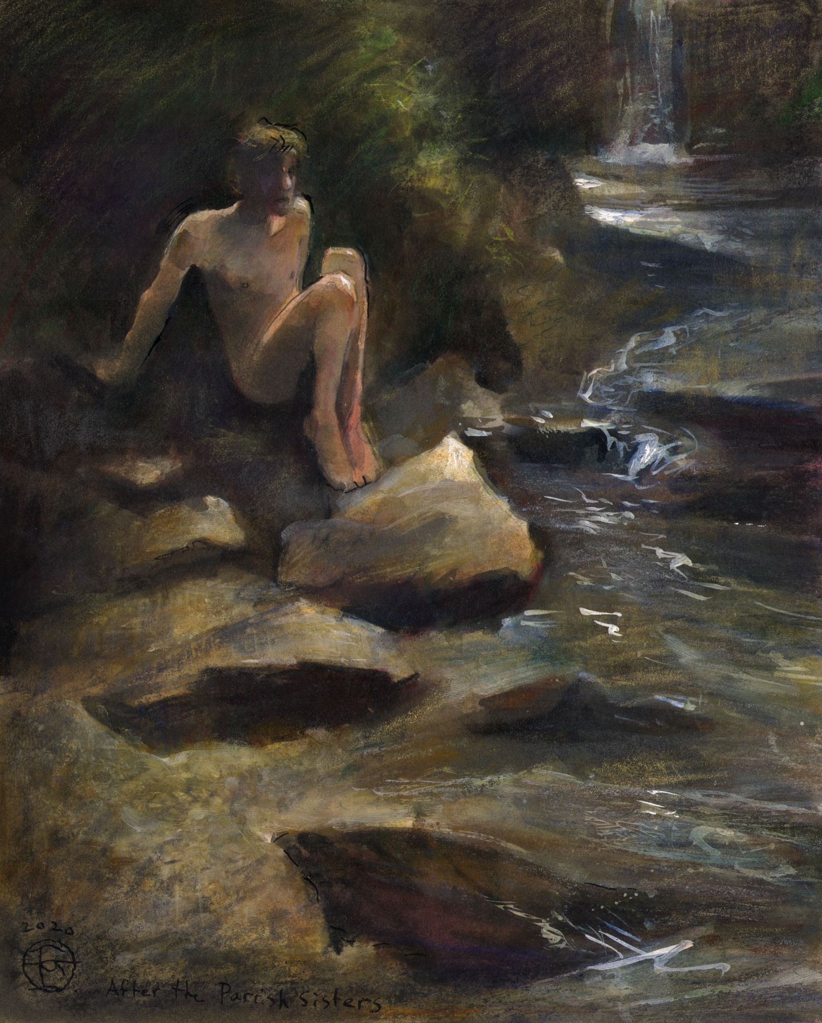 Copyright © Philip Gladstone, All Rights Reserved Additional keywords: original art, drawing, painting. male nude, woods, stream |