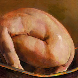 From Philip Gladstone's Tubs Series, compositions that feature bathers, animals and objects in protective, womb-like antique tubs— surreal compositions contrived to express dream-like states of mind (View additional paintings from the series here)