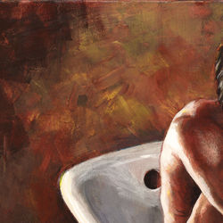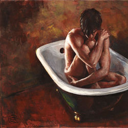 From Philip Gladstone's Tubs Series, compositions that feature bathers, animals and objects in protective, womb-like antique tubs— surreal compositions contrived to express dream-like states of mind (View additional paintings from the series here)